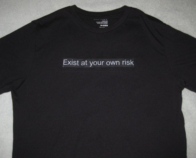 The Monk on the Block recently returned from a vacation in paradise, Hawaii at its most charming. Contrary to the seemingly peaceful ambiance of this eden was the array of signs to be found there warning of potential hazards and risks in the area. On reflection the incongruence seemed to him a metaphor for life and when he got home he had this tee shirt made –